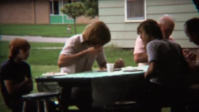 > 1971: Backyard outdoor picnic table meal with extended family.