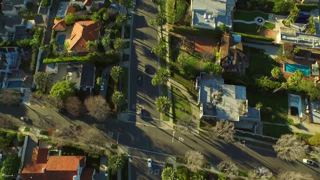 v57 Low flying vertical aerial over Beverly Hills neighborhood.