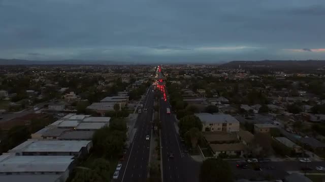 v91 Low flying aerial over Venice Blvd towards 405 at dusk.