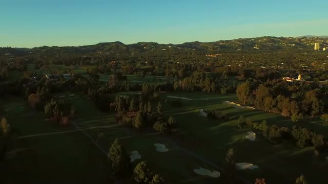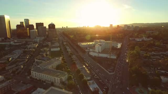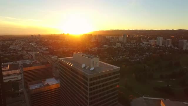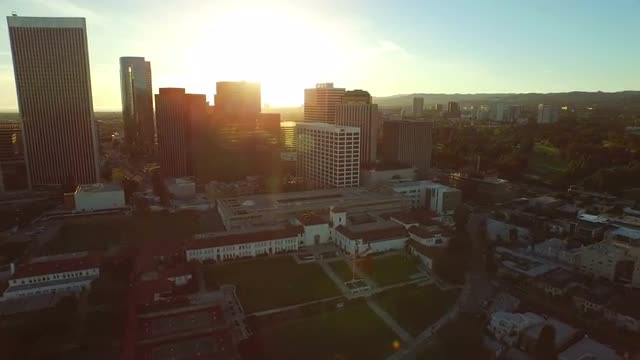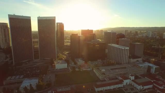 v69 Low flying aerial backwards over Century City suring sunset.