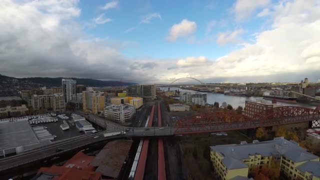 v6. Low flying Portland aerial of industrial area and over freeway.