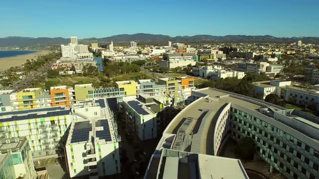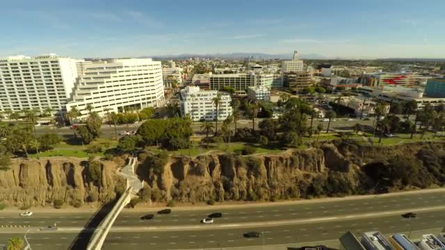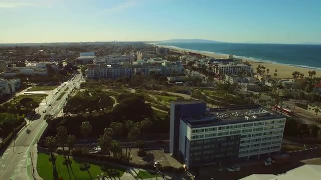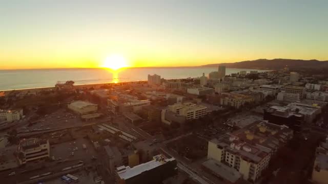 v27. Low flying LA aerial over Santa Monica during sunset.