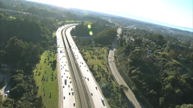 783185 - Panning aerial view of freeway traffic in valley