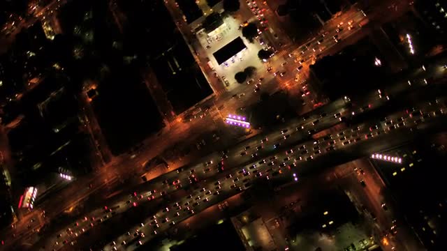 61043 - Aerial night vertical view of busy freeway city traffic, America