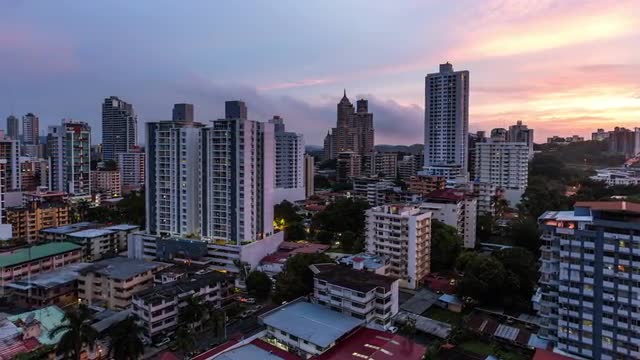 v114. Panning city traffic time lapse of Panama cityscape during sunset.