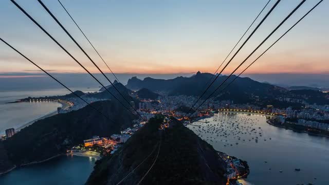 v12. Rio De Janeiro cityscape zooming time lapse after sunset over Christ The Redeemer from Sugar Loaf Mountain.