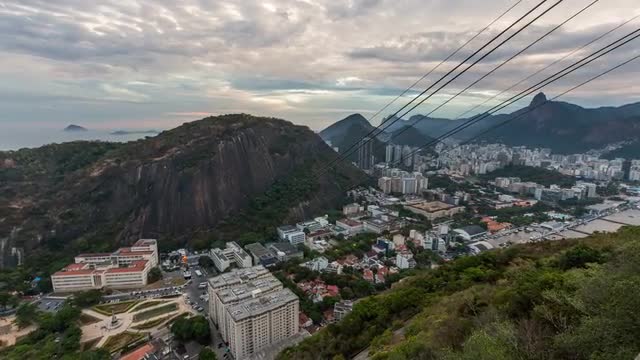 v17. Rio De Janeiro cityscape panning time lapse at dusk from lower Sugar Loaf Mountain.
