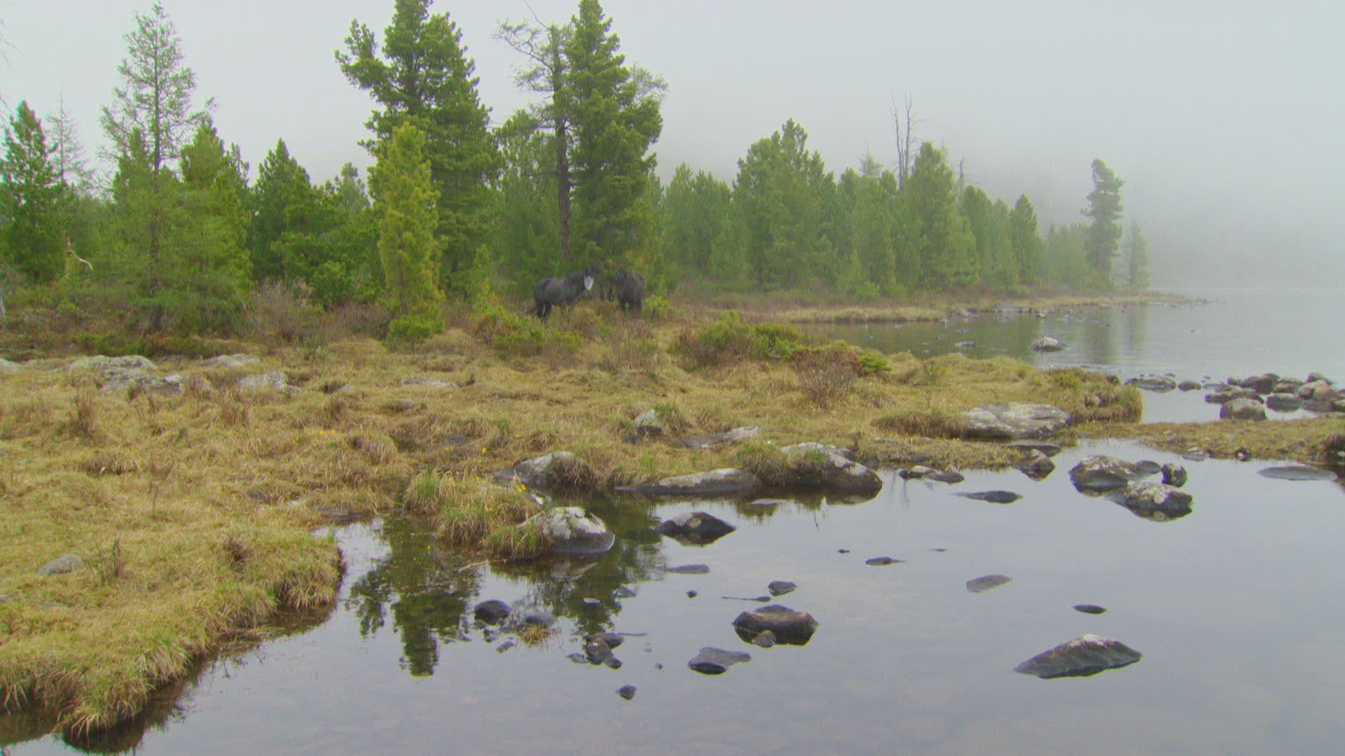 One of our quarter horses grazing in the foggy pasture during a sunrise. One of our German shepherds is running around.