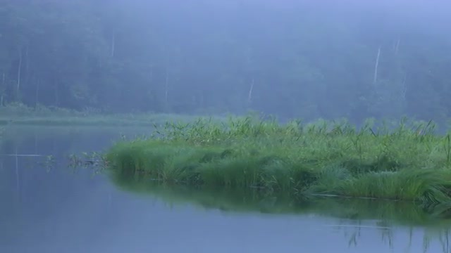 In the evening, sunbeams burst through clouds and illuminate a valley. Grass flutters in the foreground.