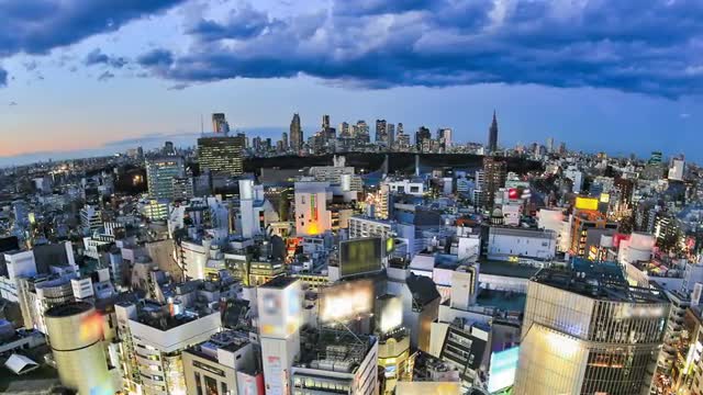 v10. Panning Tokyo cityscape time lapse over Shibuya just after sunset.