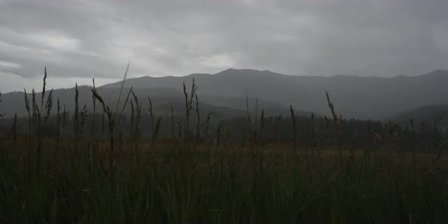 The sun illuminates the sky and backs of clouds over an expansive valley. Grass sways in the wind in the foreground.