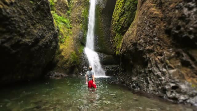 v23. Male walking past camera in a creek to base of waterfall and raising his arms in accomplishment.