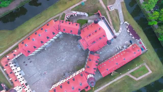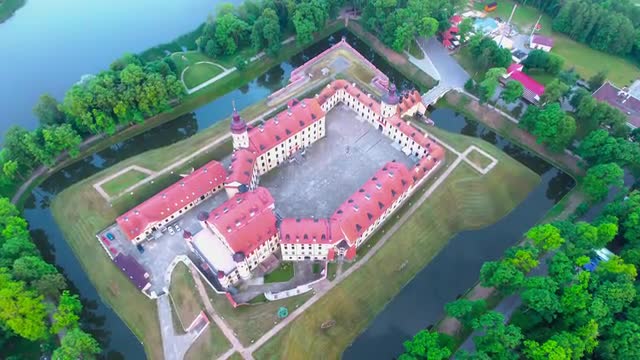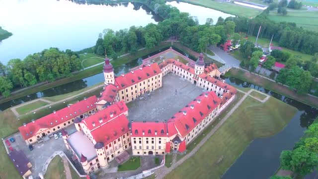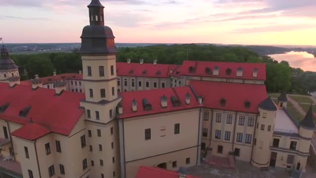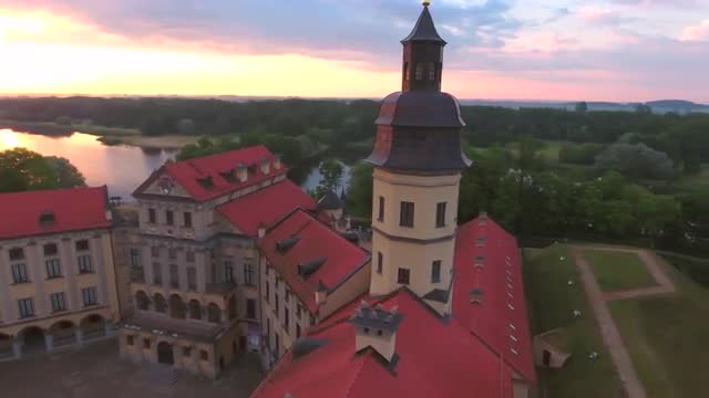 715062 - Aerial View. Flying over the castle's old town at sunset with sun rays. 4K
