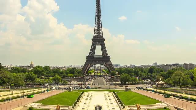 v45. Zooming city traffic time lapse in Paris with Eiffel Tower in background.