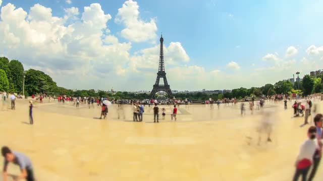 v52. Fisheye pedestrian traffic time lapse in Paris with Eiffel Tower in background.