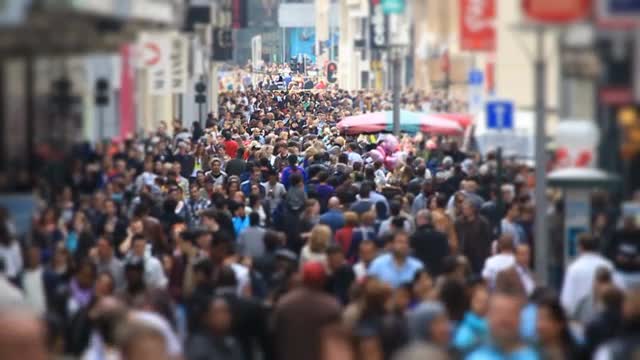 v59. Slow motion city pedestrian traffic shot on a busy Brussels shopping street using a tilt shift effect.