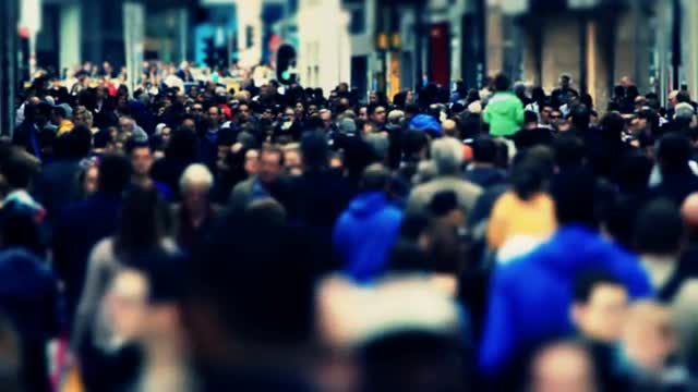 v56. Slow motion city pedestrian traffic shot on a busy Brussels shopping street with added color correction.
