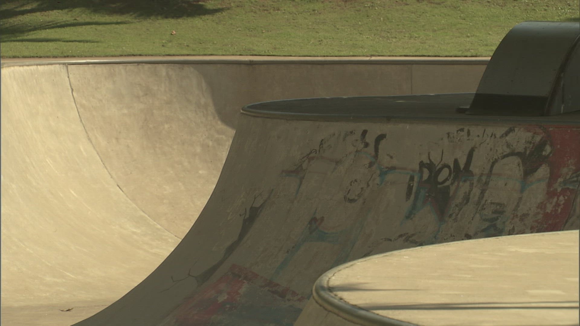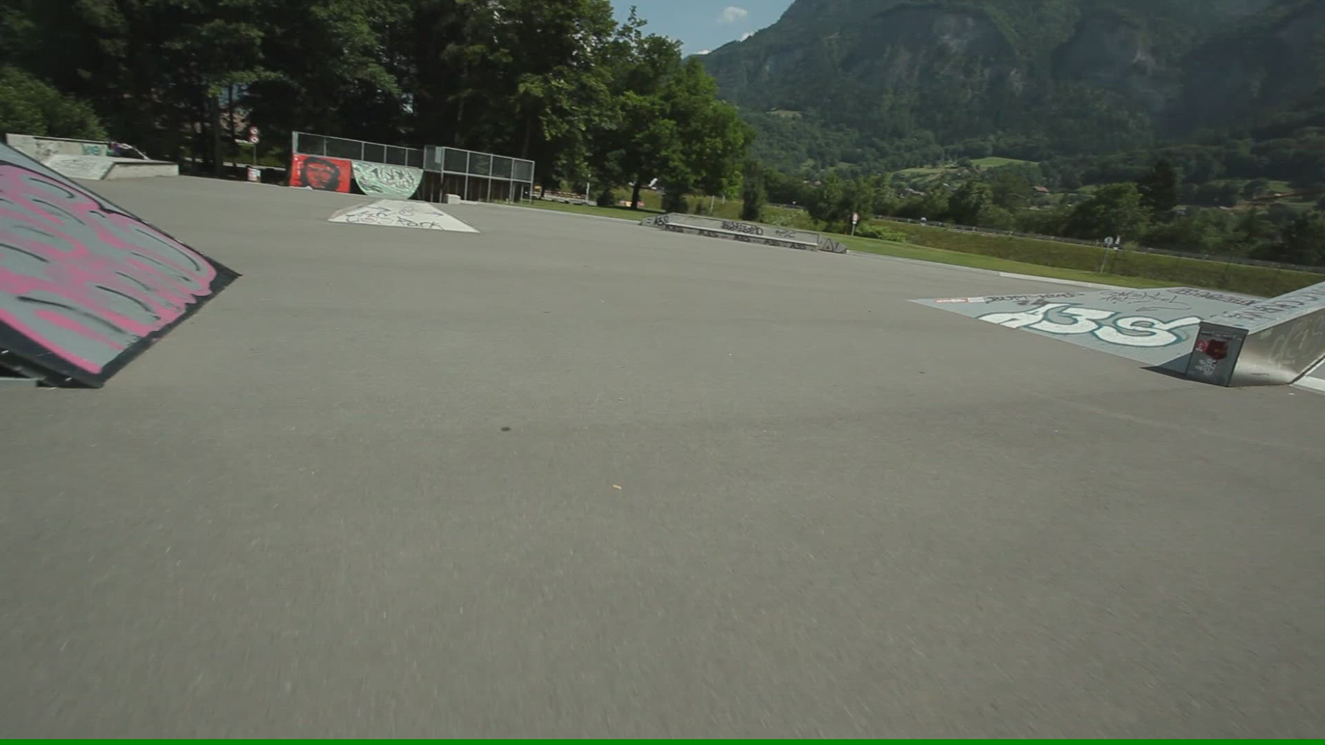 v1. Three close up shots of a skateboarder doing a 50-50 grind on a quarter ramp.