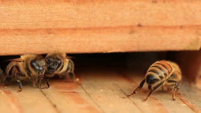 v8. Honey bees going in and out of hive.