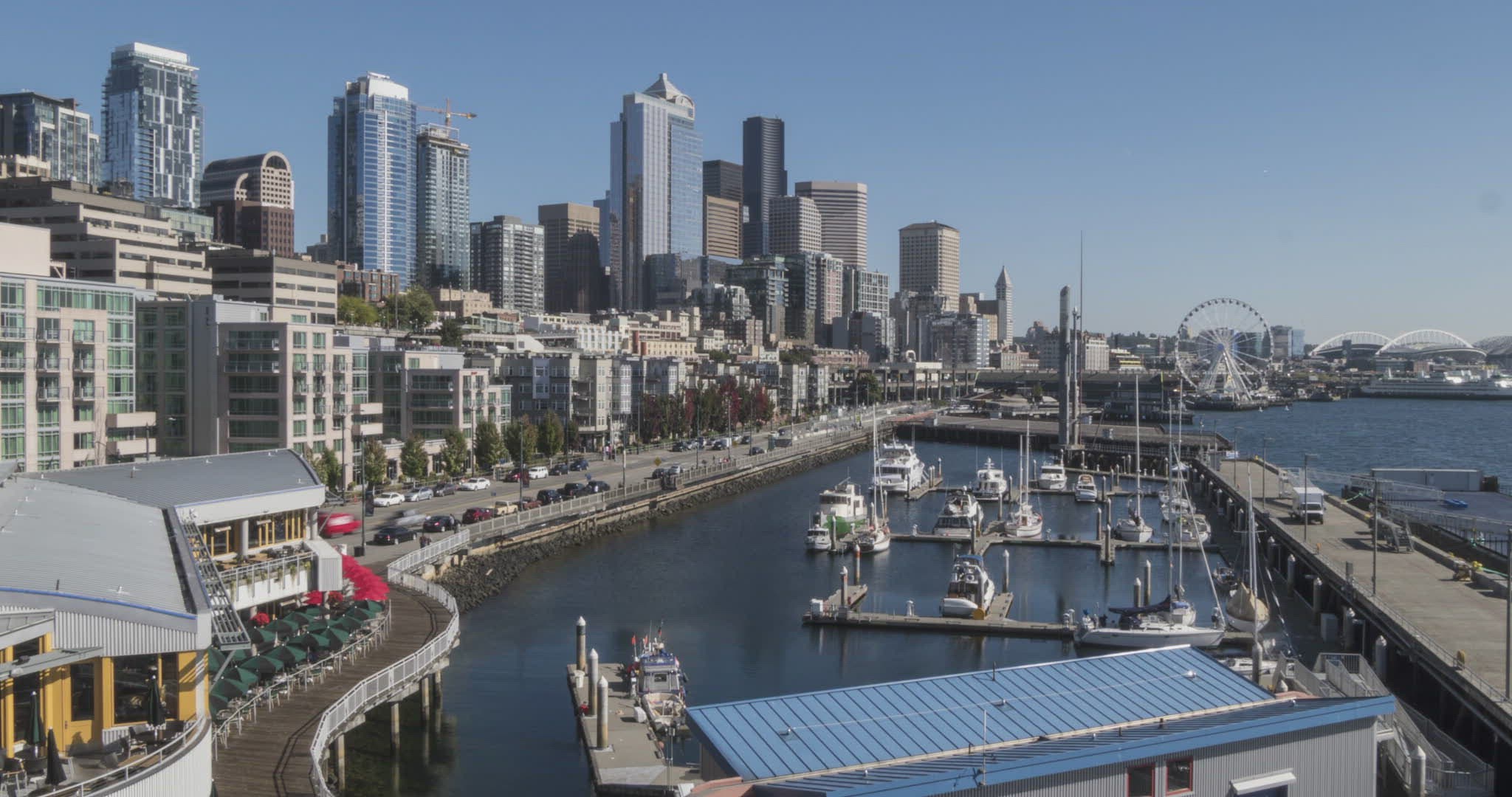 1103576 - Wide handheld shot of empty Pike Place Market in downtown Seattle