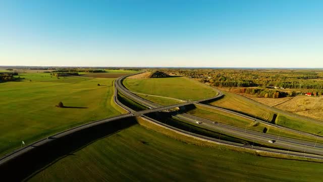 Aerial footage of freeway intersection and green fields. Colorful autumn season.
