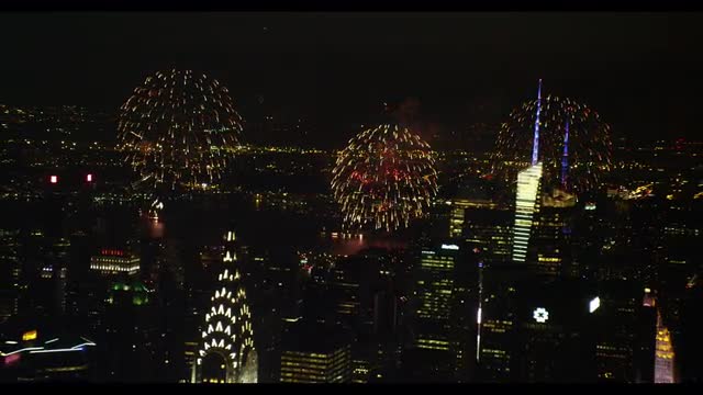 Wide Shot Sweeping Fireworks, to Empire, Bank America and Conde Nast