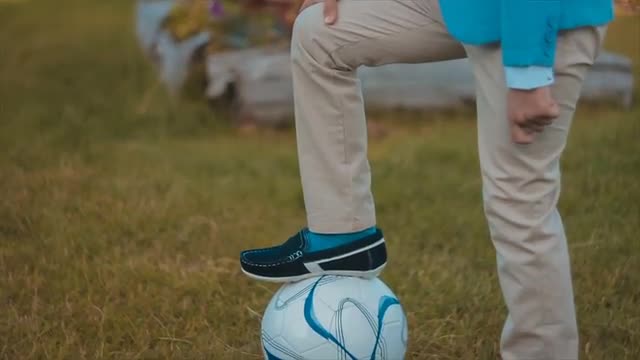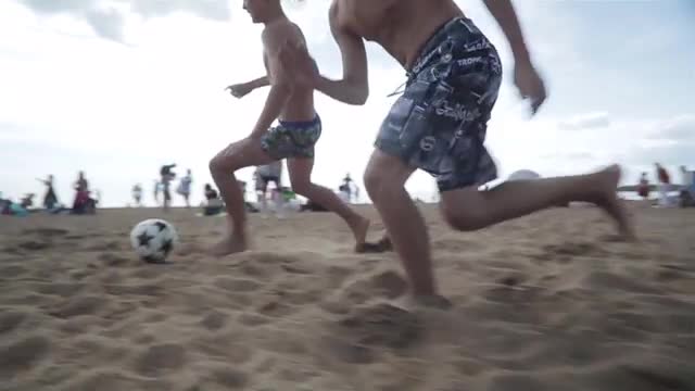 Slow motion game of beach soccer. Kids enjoy a local game of soccer/football.