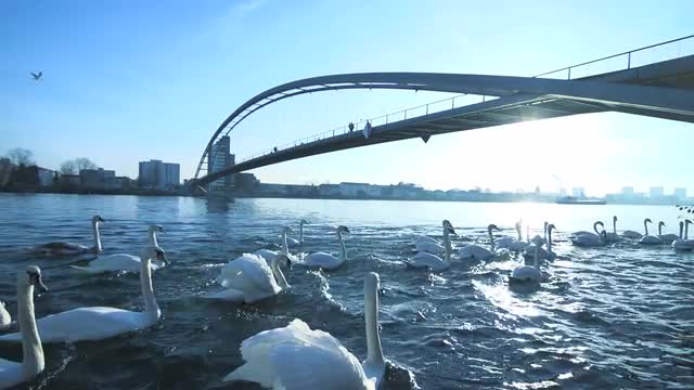 Swans chilling on lake in the early fall. Slow motion.