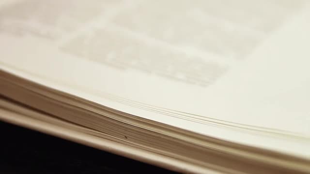Ungraded: Slow flipping book pages. The book is illustrated with black-and-white photos. Shallow depth-of-field. (av11102u)