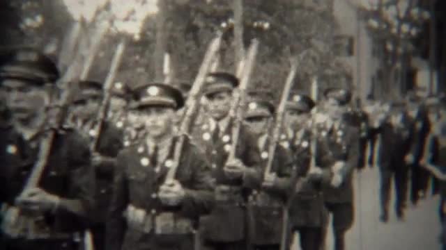 > 1939: Military soldiers marching with rifles in small town parade.