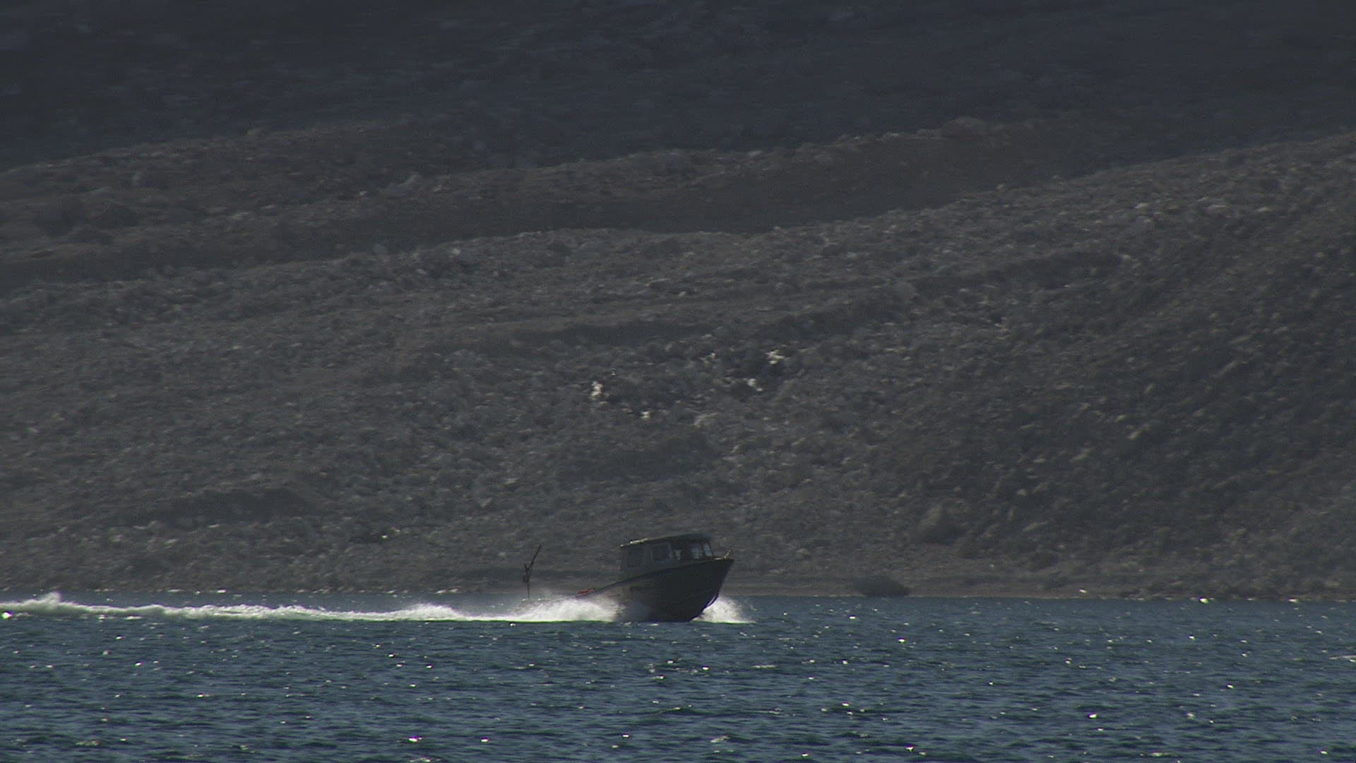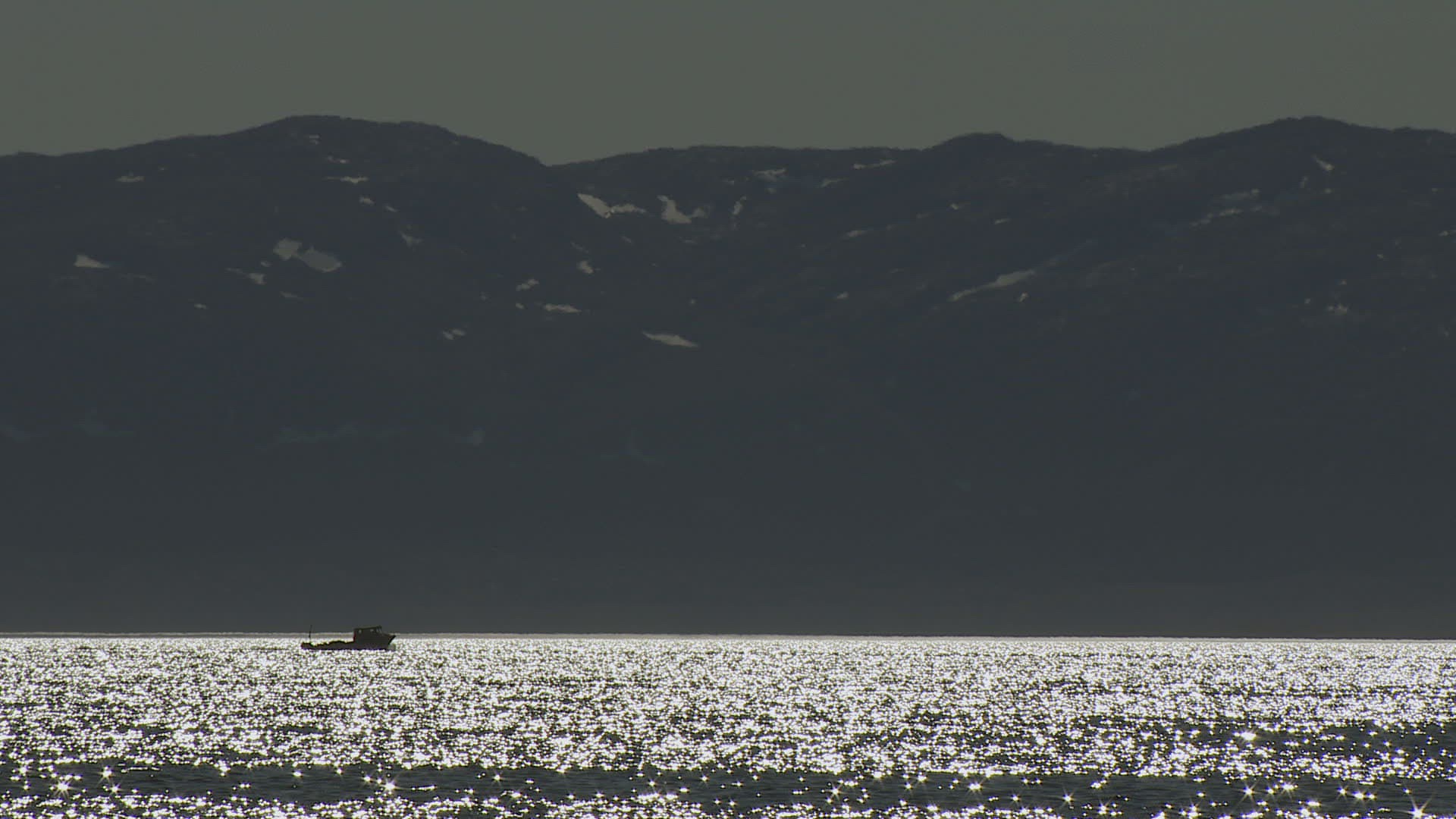 Moving shot of broken dock. Eire mountains and low laying fog, Weaving between dock sited shows the rest between journeys out to sea.