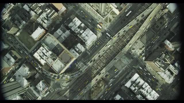 Straight down view, building, highways, cars