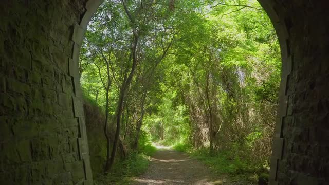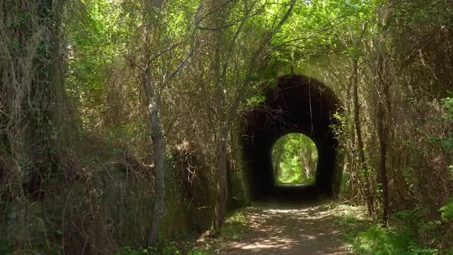 1101006 - Camera advances between the forest to a tunnel