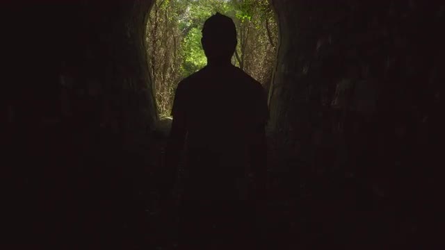 1101004 - Camera leaves dark tunnel to sunny forest