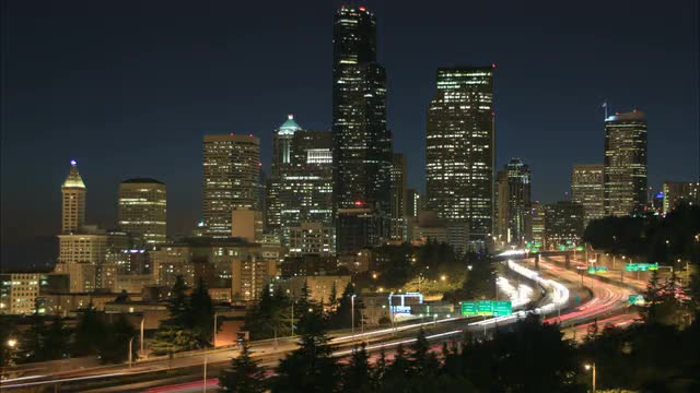 v15. Seattle cityscape time lapse at night with I-5 traffic.
