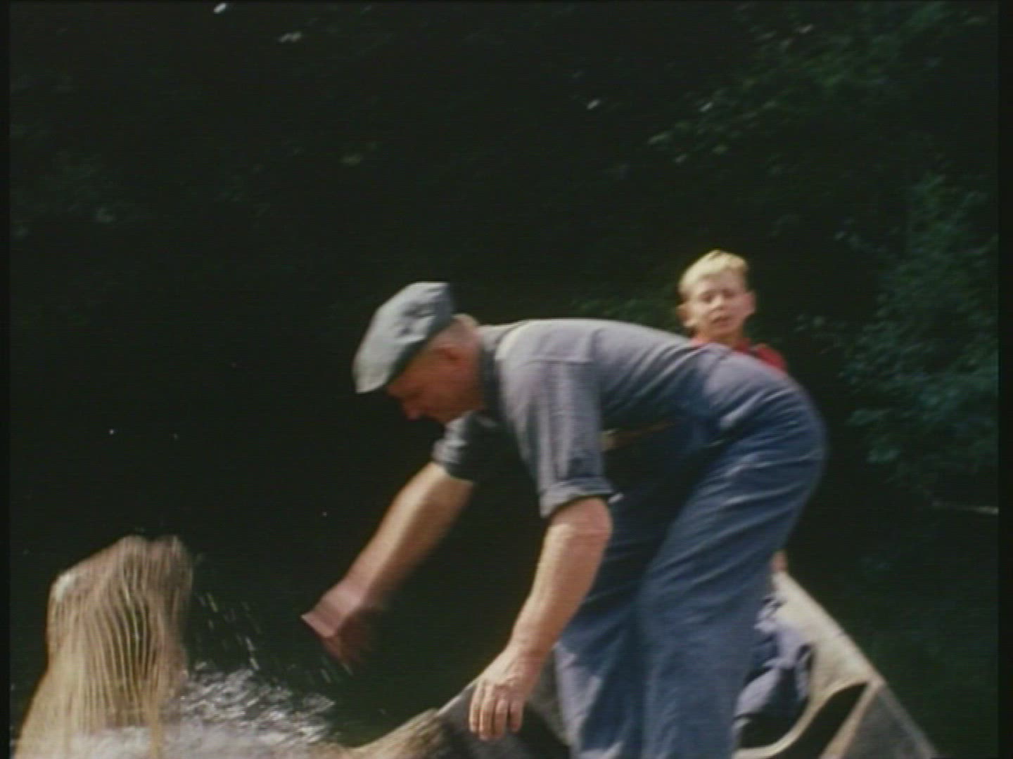 > 1962: Boy playing with toy boats in sad muddy driveway puddle.