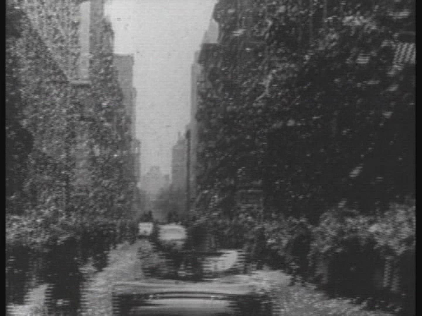 1945: Patriotic USA flag parade down small town mainstreet.