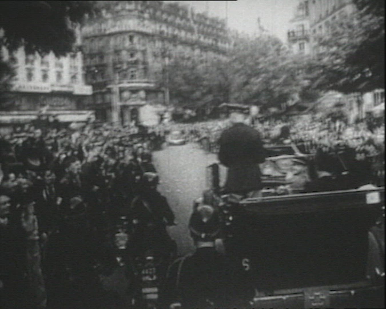 > 1945: Patriotic USA flag parade down small town mainstreet.