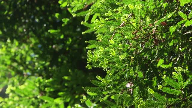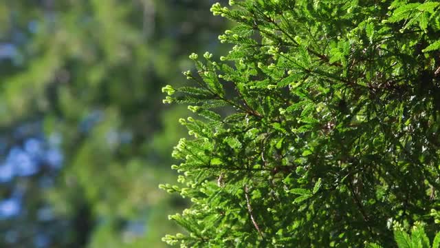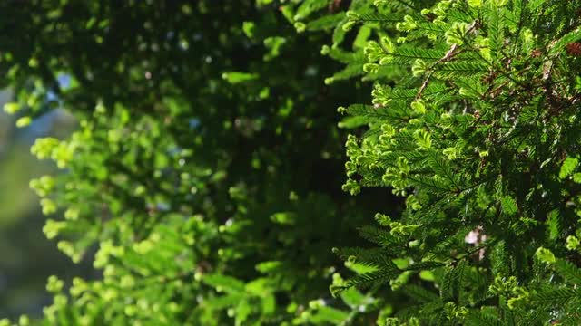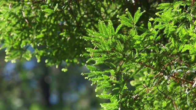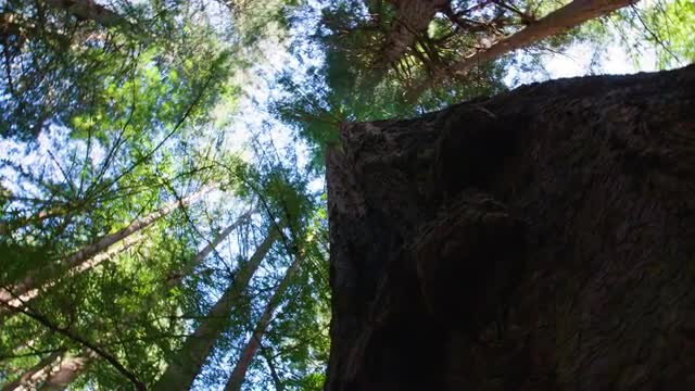 Slow motion shot of sunlight shining through tree branches on a hiking trail in the Pacific Northwest.