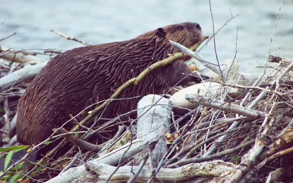 Slow motion shot of a beaver building his dam