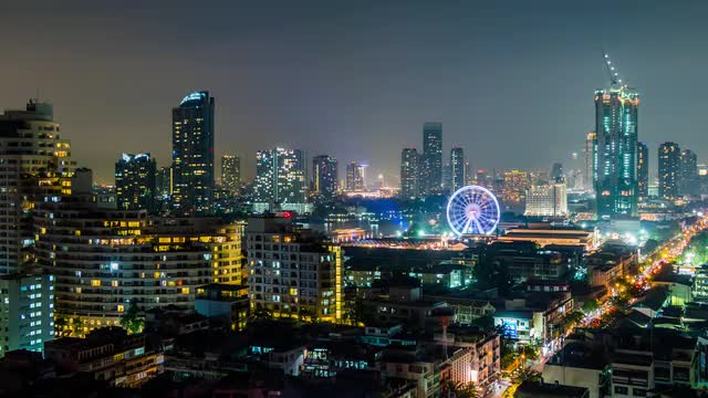 > Night timelapse of the cityscape of Bangkok with ferris wheel, Thailand