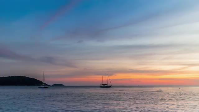 Timelapse of sunset over sea bay with yachts at Phuket Island, Thailand