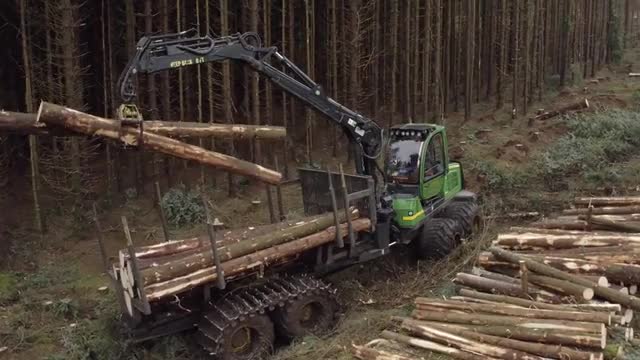 Aerial drone view of forestry operation. A forest loader picks up and loads freshly felled trees.