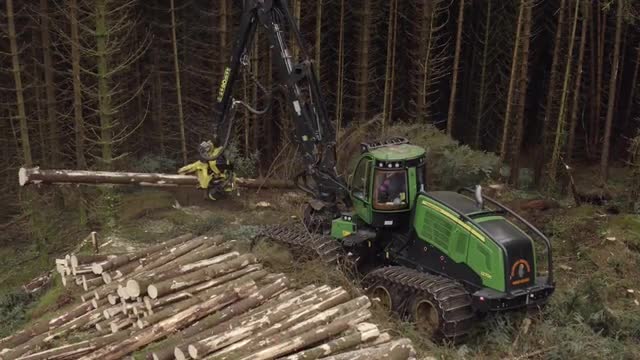 Aerial drone view of forestry operation. A forest harvester fells trees on the edge of a forest.