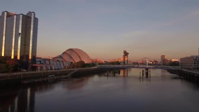 Drone fly over bridge above River Clyde, Glasgow at dusk