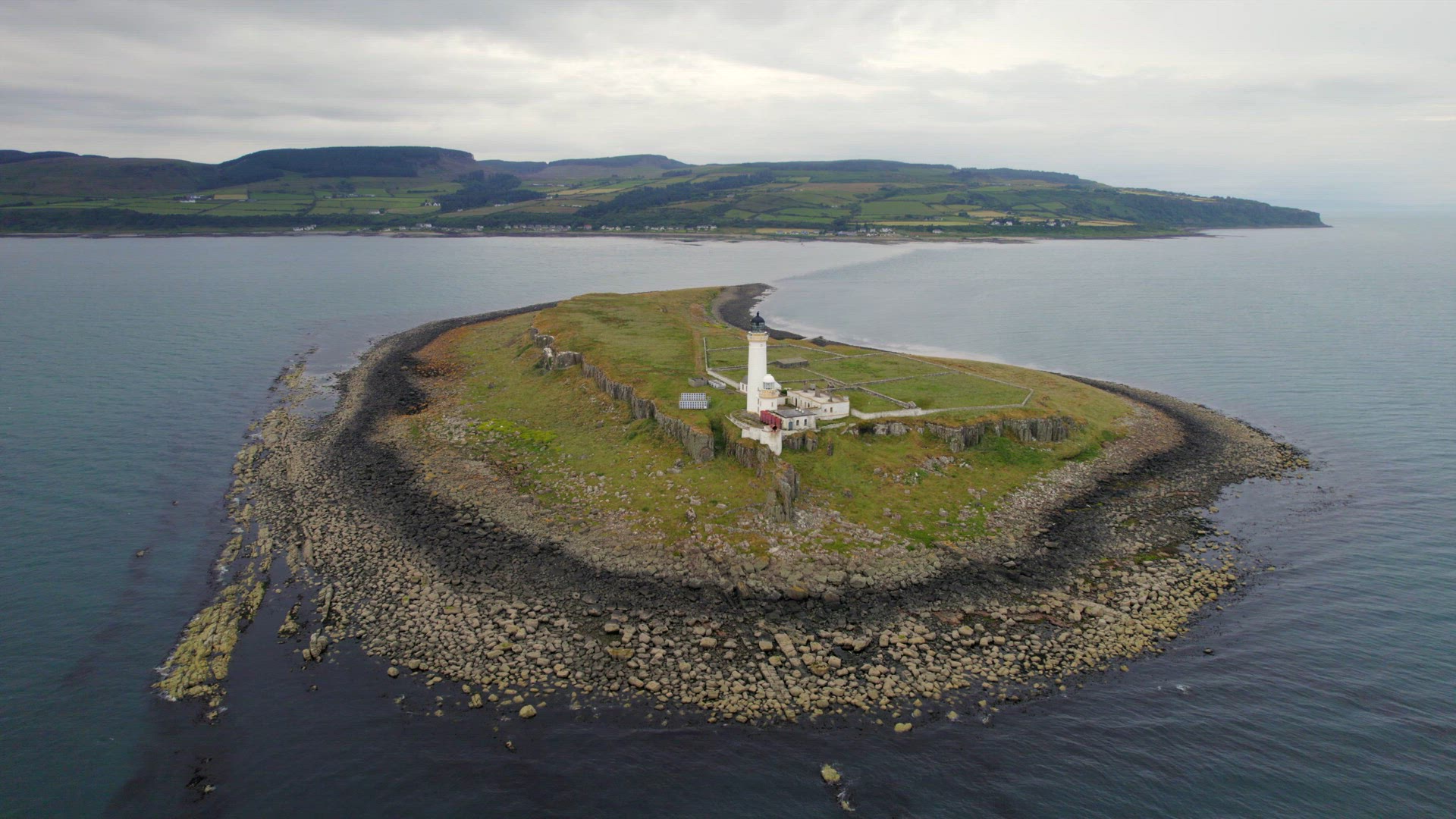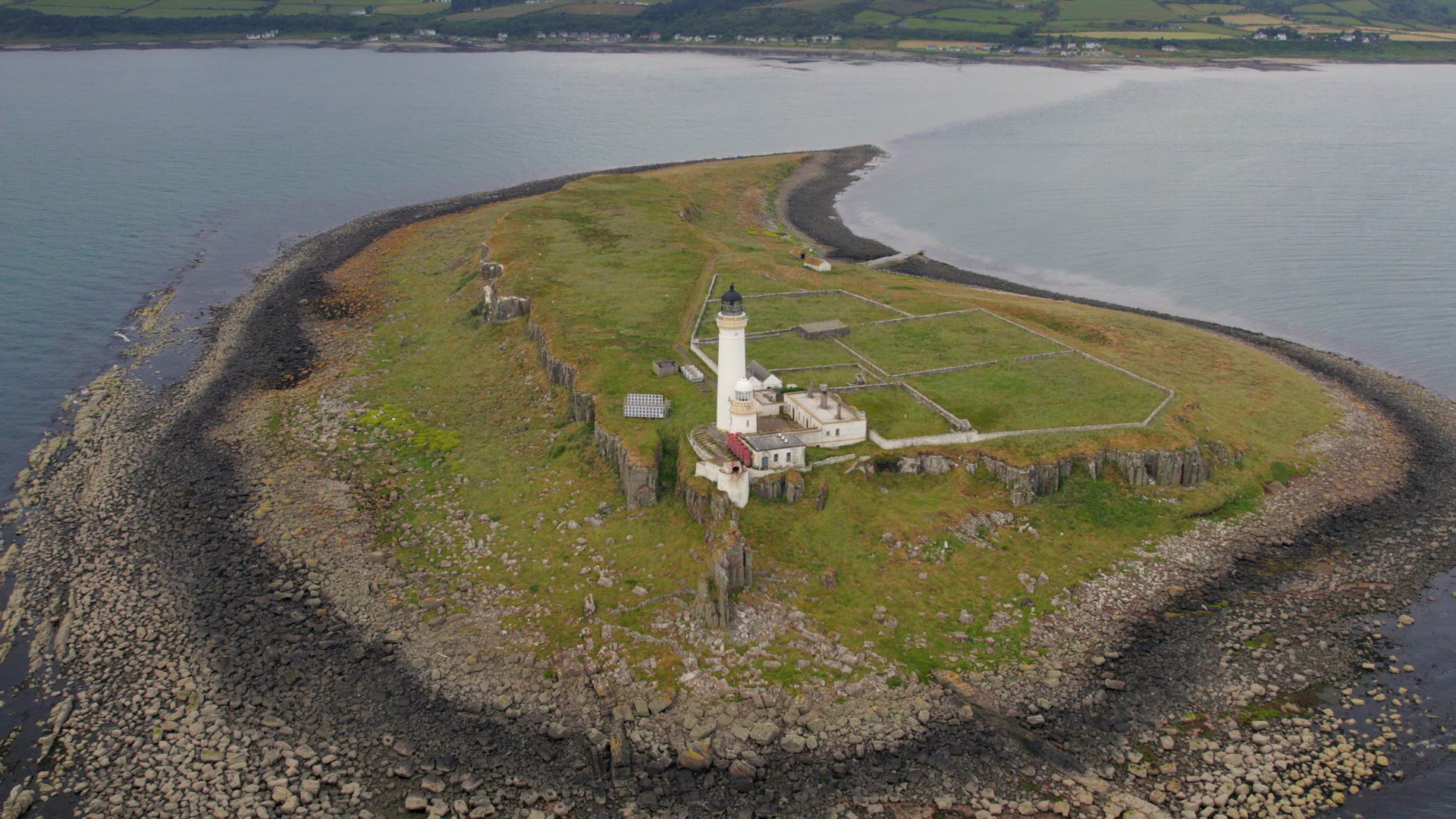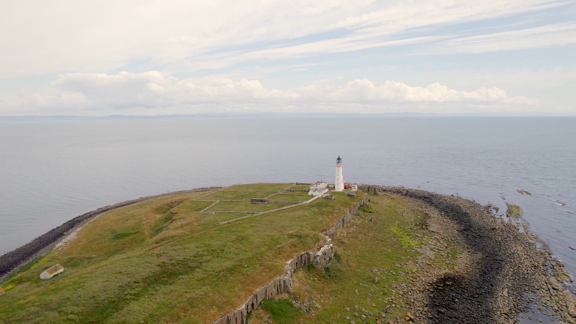 Aerial drone view of a farmer ploughing his field with seagulls flying overhead on the Isle of Tiree, Scotland