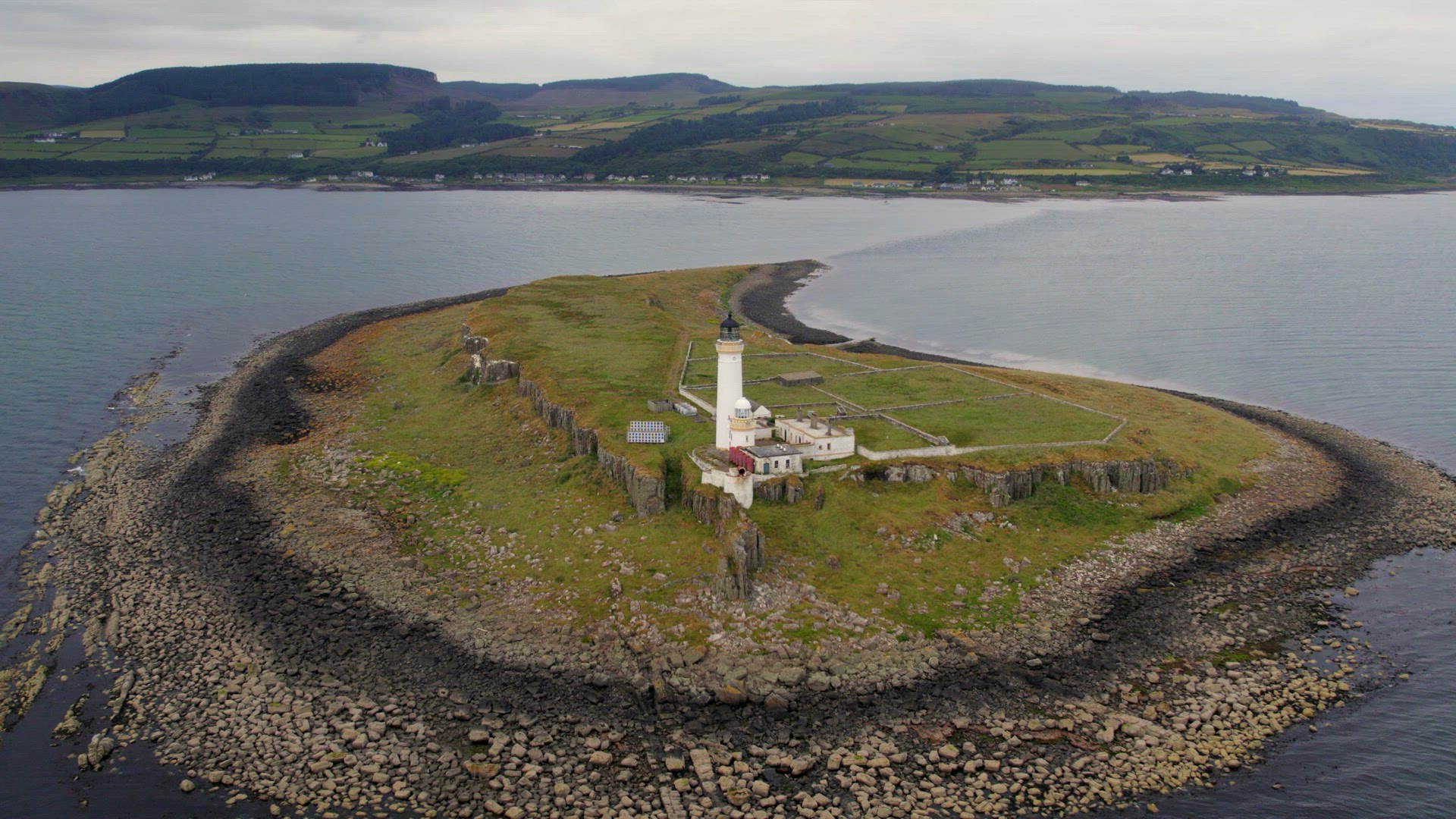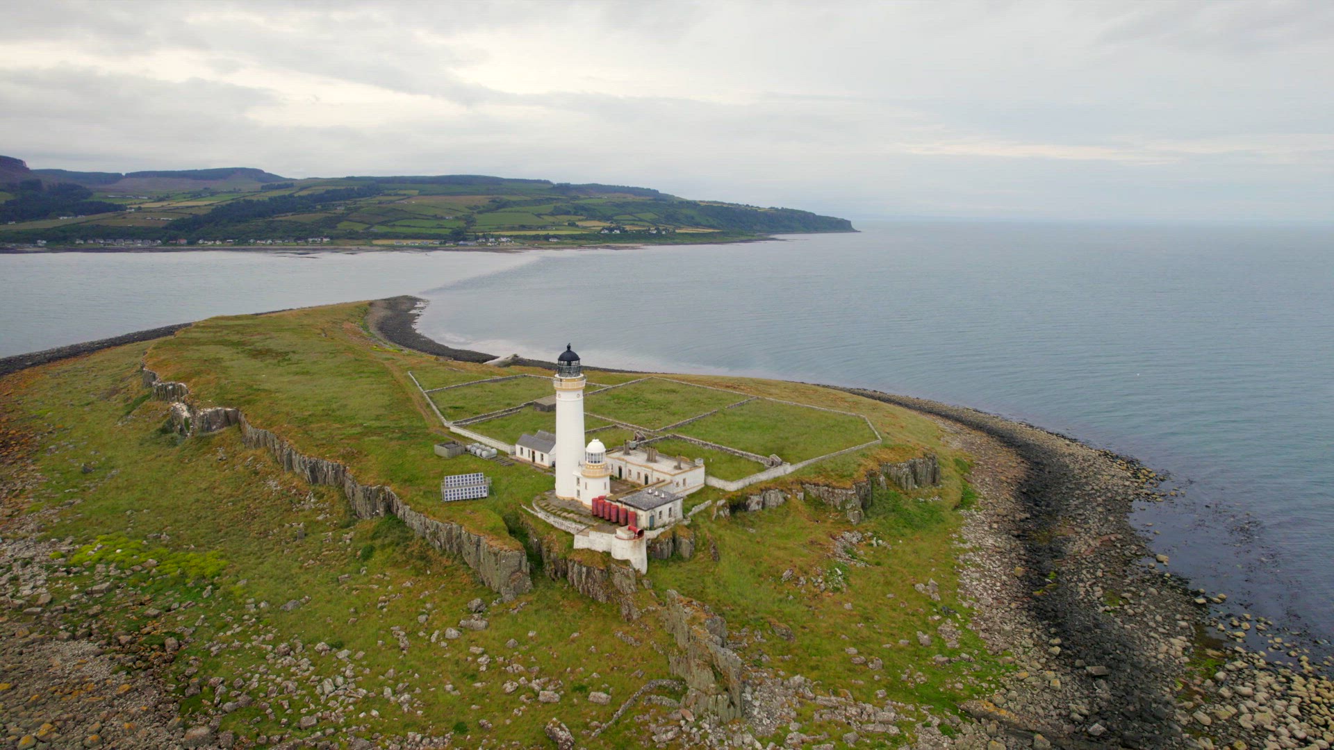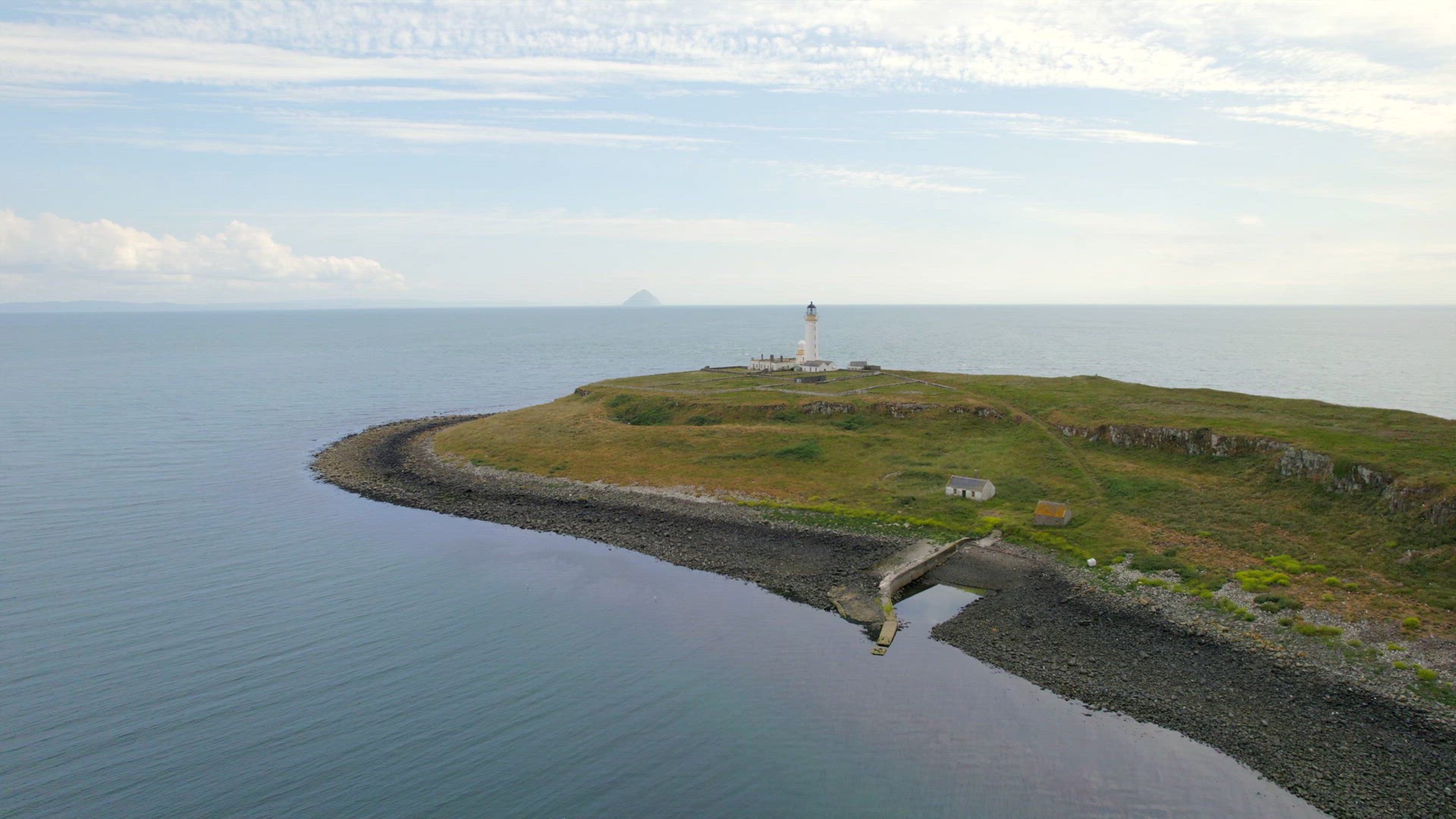 Aerial drone view of a farmer ploughing his field with seagulls flying overhead on the Isle of Tiree, Scotland