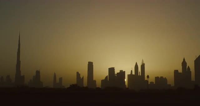 Moving shot of the sun setting over the Dubai cityscape