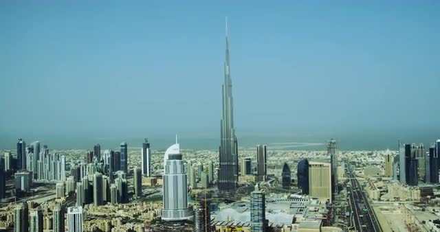 Aerial of Dubai focusing on the Burj Khalifa