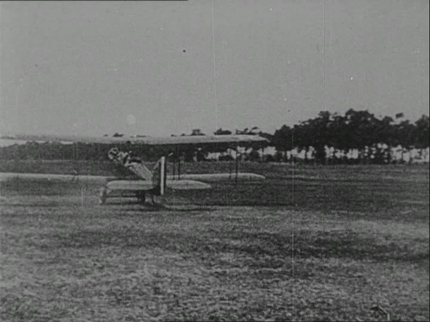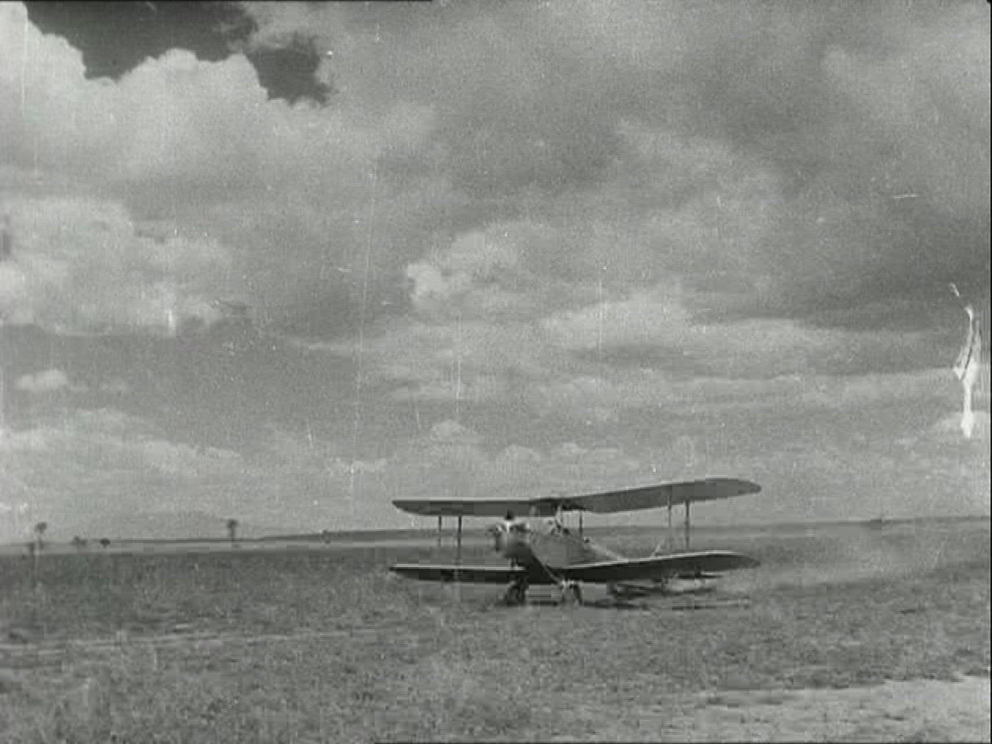 > 1934: Propeller plane landing in primitive airport landing strip.